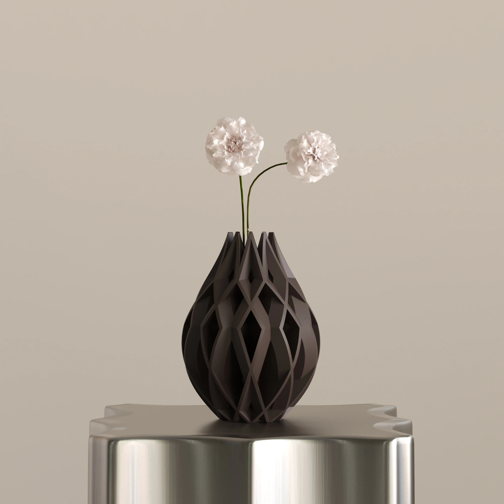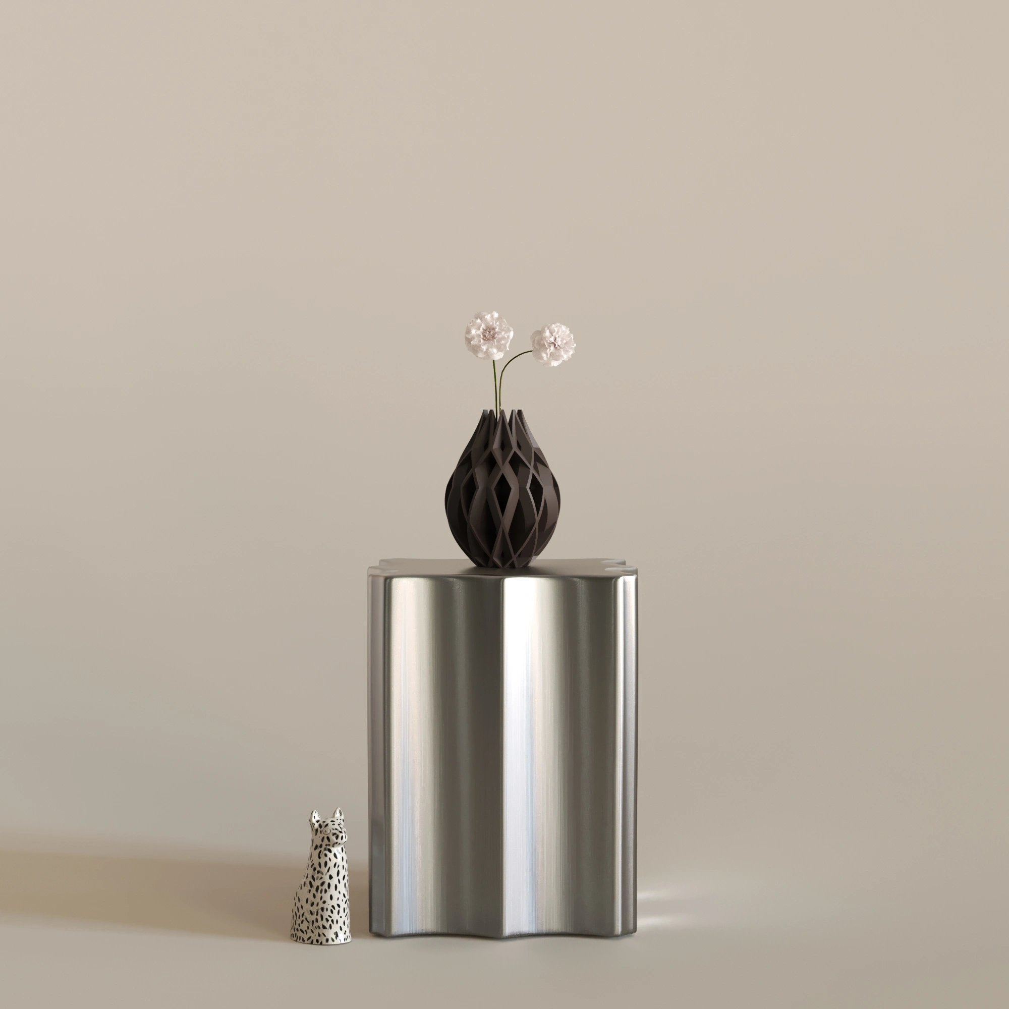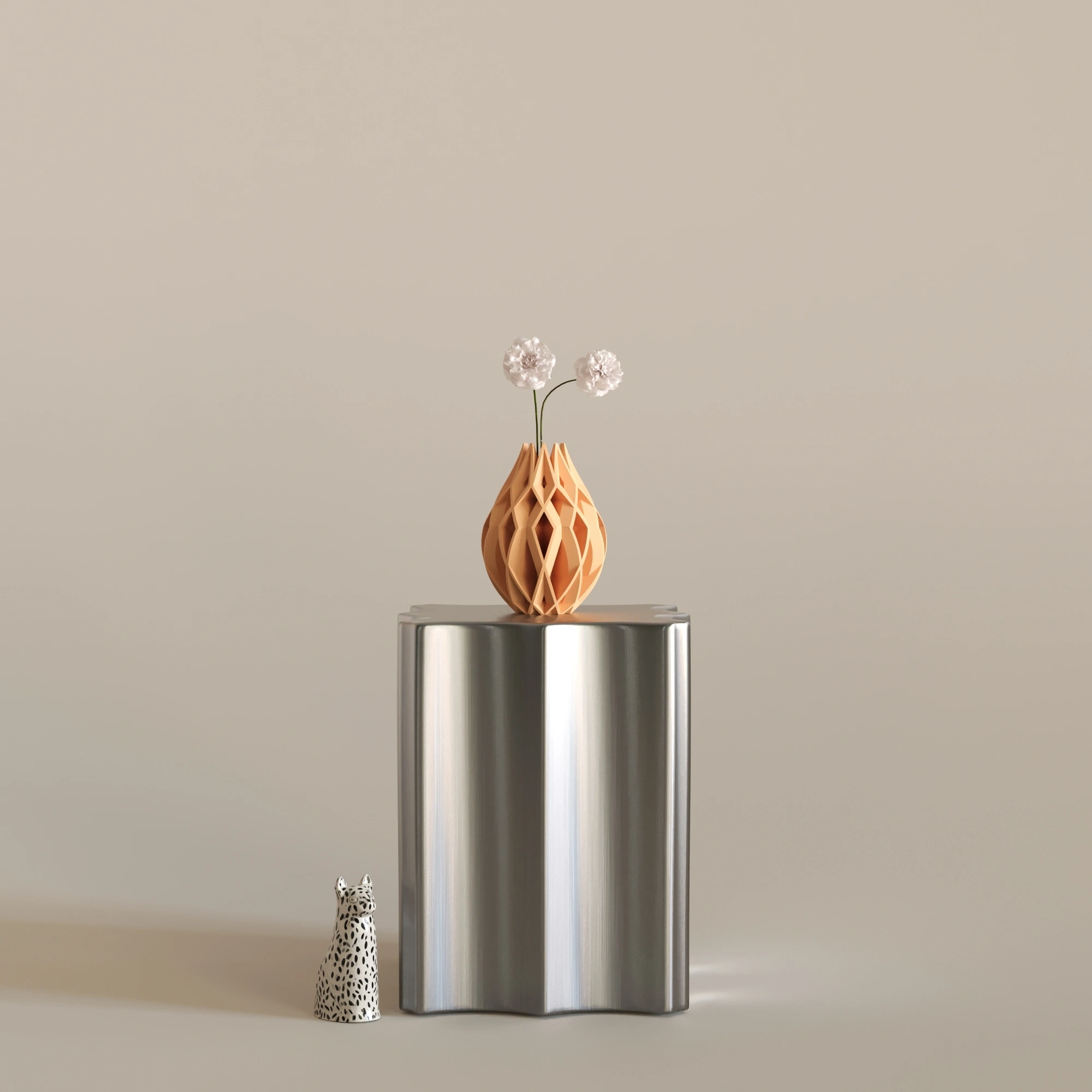 Figura 3, 23 cm x 30 cm ölçülerindedir. Bitkisel bazlı, doğada çözünebilen biyopolimer PLA malzemeden üretilmiştir. Cam veya seramik değildir. Hafif yapısına rağmen dayanıklı ve uzun ömürlü kullanım sunar. Dekoratif amaçlı tasarlanmıştır. Modern, sanatsal ve heykelsi dekorasyon anlayışını benimseyen yaşam alanları için güçlü ve etkileyici bir dekorasyon objesidir.